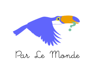 Logo Pélican bleu avec branche d'herbe dans le bec. En dessous il est écrit "Parle le Monde".